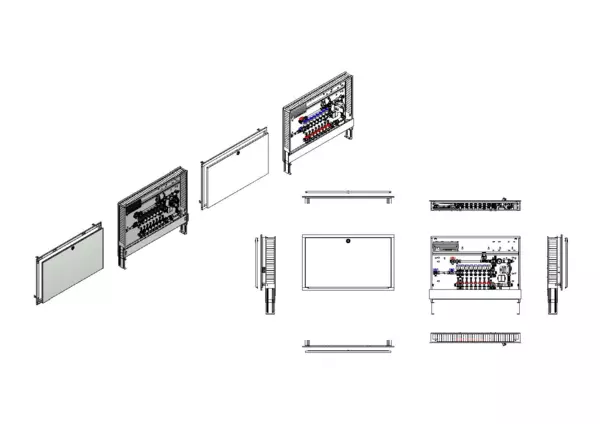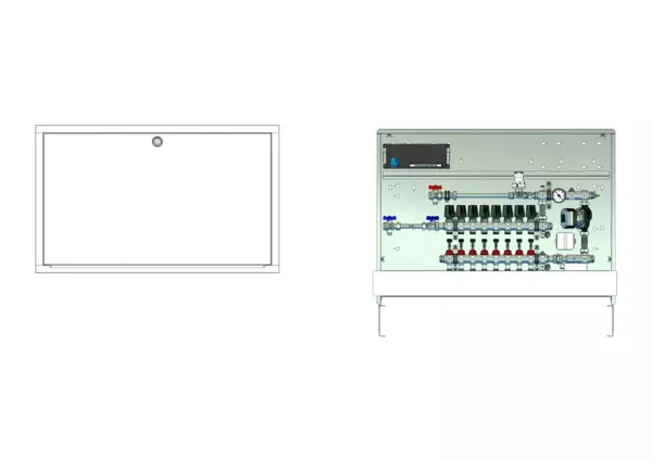 Die Regelstation für Flächenheizung ist mit einer Festwertregelung 20-50 °C ausgestattet. Die im Unterputzschrank montierte Regelgruppe umfasst eine Umwälzpumpe, einen Edelstahlverteiler mit regulierbaren Durchflussanzeigern und Ventileinsätzen (M30x1,5), sowie eine horizontale Anschlussgarnitur mit Wärmezählerverrohrung. Die vormontierten und verdrahteten Stellantriebe sind auf einer montierten Klemmleiste installiert. Es gibt Platzhaltungen für Wasserzählereinbaustrecken.
