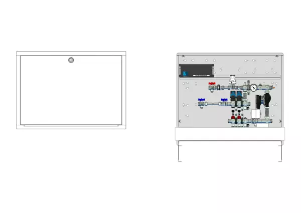 strawa Comfort Regelstation FBR-18-H-WMZ-C69-EGO 2 Hkr.,BxHxT: 900x775x122 mm, Festwert 20-50°C m. Pumpe, horz. AG m. WMZ, Verteiler m. DFA min/max+THV f. EGO, m. vorm. EGO-Regelantr. u. Klemml. m. Vorverdr., Comfort-UP-Schrank m. Frontbl. RAL 9016