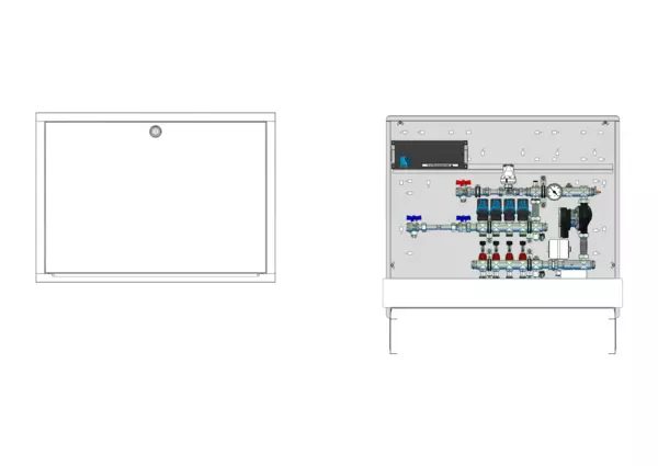strawa Comfort Regelstation FBR-18-H-WMZ-C69-EGO 4 Hkr.,BxHxT: 900 x 775 x 122 mm, Festwert 20-50°C m. Pumpe, horz. AG m. WMZ, Verteiler m. DFA min/max+THV f. EGO, m. vorm. EGO-Regelantr. u. Klemml. m. Vorverdr., Comfort-UP-Schrank m. Frontbl. RAL 9016