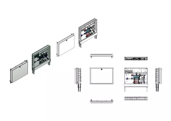 Die Regelstation für Flächenheizung ist mit einer Festwertregelung 20-50 °C ausgestattet. Die im Unterputzschrank montierte Regelgruppe umfasst eine Umwälzpumpe, einen Edelstahlverteiler mit absperrbaren Durchflussanzeigern und Ventileinsätzen für EGO-Schnellverschluss, sowie eine horizontale Anschlussgarnitur mit Wärmezählerverrohrung. Die vormontierten und verdrahteten EGO-Regelantriebe sind auf einer montierten Klemmleiste installiert. Es gibt Platzhaltungen für Wasserzählereinbaustrecken.
