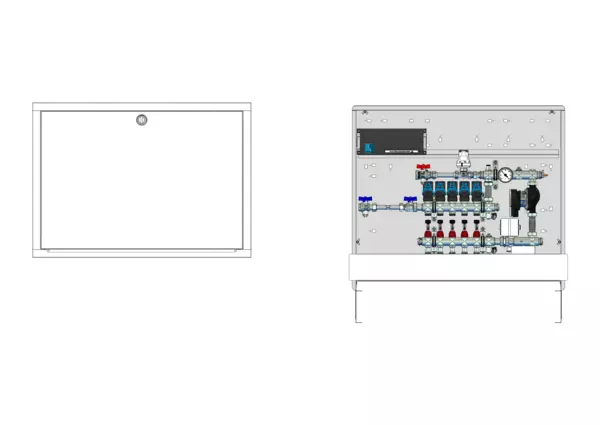 strawa Comfort Regelstation FBR-18-H-WMZ-C69-EGO 5 Hkr.,BxHxT: 900x775x122 mm, Festwert 20-50°C m. Pumpe, horz. AG m. WMZ, Verteiler m. DFA min/max+THV f. EGO, m. vorm. EGO-Regelantr. u. Klemml. m. Vorverdr., Comfort-UP-Schrank m. Frontbl. RAL 9016
