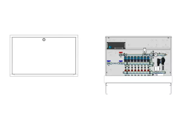 strawa Comfort Regelstation FBR-18-H-WMZ-C69-EGO 8 Hkr.,BxHxT: 1050x775x122 mm, Festwert 20-50°C m. Pumpe, horz. AG m. WMZ, Verteiler m. DFA min/max+THV f. EGO, m. vorm. EGO-Regelantr. u. Klemml. m. Vorverdr., Comfort-UP-Schrank m. Frontbl. RAL 9016