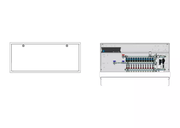 strawa Comfort Regelstation FBR-18-H-WMZ-C69-EGO 12 Hkr.,BxHxT: 1500 x 775 x 122 mm, Festwert 20-50°C m. Pumpe, horz. AG m. WMZ, Verteiler m. DFA min/max+THV f. EGO, m. vorm. EGO-Regelantr. u. Klemml. m. Vorverdr., Comfort-UP-Schrank m. Frontbl. RAL 9016