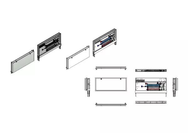 Die Regelstation für Flächenheizung ist mit einer Festwertregelung 20-50 °C ausgestattet. Die im Unterputzschrank montierte Regelgruppe umfasst eine Umwälzpumpe, einen Edelstahlverteiler mit absperrbaren Durchflussanzeigern und Ventileinsätzen für EGO-Schnellverschluss, sowie eine horizontale Anschlussgarnitur mit Wärmezählerverrohrung. Die vormontierten und verdrahteten EGO-Regelantriebe sind auf einer montierten Klemmleiste installiert. Es gibt Platzhaltungen für Wasserzählereinbaustrecken.