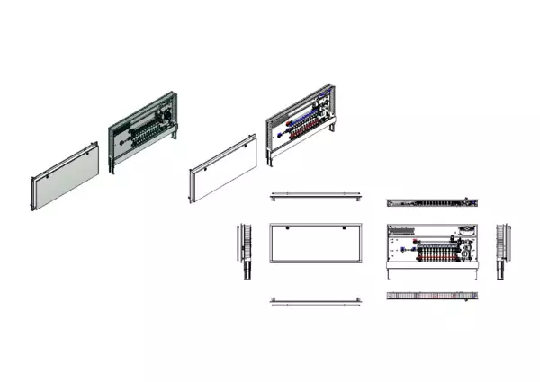 Regelstation für Flächenheizung mit Festwertregelung 20-50 °C, im Unterputzschrank montierte Regelgruppe mit Umwälzpumpe, Edelstahlverteiler mit regulierbaren Durchflussanzeigern und Ventileinsätzen (M30x1,5), horizontale Anschlussgarnitur mit Wärmezählerverrohrung und Wasserzählereinbaustrecke für Trinkwasser kalt, vormontierte und vorverdrahtete Stellantriebe auf vormontierter Klemmleiste