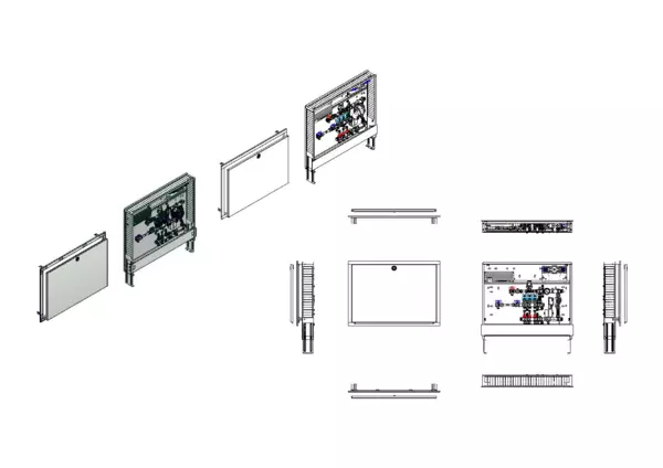 Die Regelstation für Flächenheizung ist mit einer Festwertregelung 20-50 °C ausgestattet. Die im Unterputzschrank montierte Regelgruppe umfasst eine Umwälzpumpe, einen Edelstahlverteiler mit absperrbaren Durchflussanzeigern und Ventileinsätzen für EGO-Schnellverschluss, sowie eine horizontale Anschlussgarnitur mit Wärmezählerverrohrung. Zusätzlich ist eine Wasserzählereinbaustrecke für Trinkwasser kalt vorhanden. Die vormontierten und verdrahteten EGO-Regelantriebe sind auf einer montierten Klemmleiste installiert.