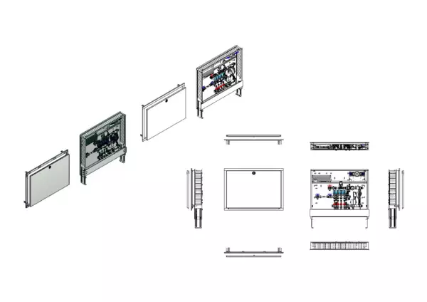 Die Regelstation für Flächenheizung ist mit einer Festwertregelung 20-50 °C ausgestattet. Die im Unterputzschrank montierte Regelgruppe umfasst eine Umwälzpumpe, einen Edelstahlverteiler mit absperrbaren Durchflussanzeigern und Ventileinsätzen für EGO-Schnellverschluss, sowie eine horizontale Anschlussgarnitur mit Wärmezählerverrohrung. Zusätzlich ist eine Wasserzählereinbaustrecke für Trinkwasser kalt vorhanden. Die vormontierten und verdrahteten EGO-Regelantriebe sind auf einer montierten Klemmleiste installiert.