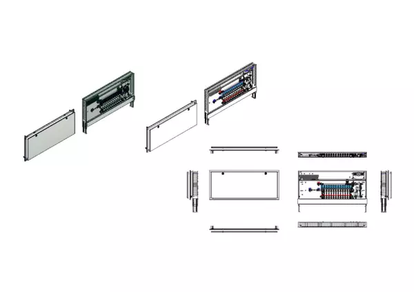 Die Regelstation für Flächenheizung ist mit einer Festwertregelung 20-50 °C ausgestattet. Die im Unterputzschrank montierte Regelgruppe umfasst eine Umwälzpumpe, einen Edelstahlverteiler mit absperrbaren Durchflussanzeigern und Ventileinsätzen für EGO-Schnellverschluss, sowie eine horizontale Anschlussgarnitur mit Wärmezählerverrohrung. Zusätzlich ist eine Wasserzählereinbaustrecke für Trinkwasser kalt vorhanden. Die vormontierten und verdrahteten EGO-Regelantriebe sind auf einer montierten Klemmleiste installiert.