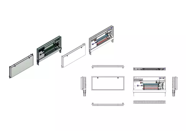 Die Regelstation für Flächenheizung ist mit einer Festwertregelung 20-50 °C ausgestattet. Die im Unterputzschrank montierte Regelgruppe umfasst eine Umwälzpumpe, einen Edelstahlverteiler mit absperrbaren Durchflussanzeigern und Ventileinsätzen für EGO-Schnellverschluss, sowie eine horizontale Anschlussgarnitur mit Wärmezählerverrohrung. Zusätzlich ist eine Wasserzählereinbaustrecke für Trinkwasser kalt vorhanden. Die vormontierten und verdrahteten EGO-Regelantriebe sind auf einer montierten Klemmleiste installiert.