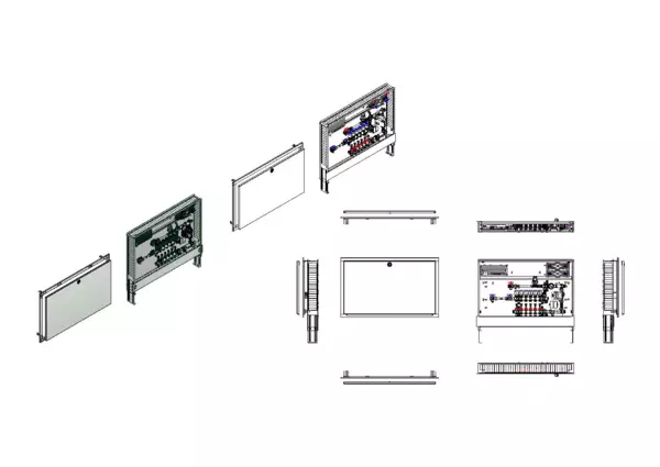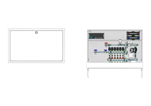 Die Regelstation für Flächenheizung ist mit einer Festwertregelung 20-50 °C ausgestattet. Die im Unterputzschrank montierte Regelgruppe umfasst eine Umwälzpumpe, einen Edelstahlverteiler mit regulierbaren Durchflussanzeigern und Ventileinsätzen (M30x1,5), sowie eine horizontale Anschlussgarnitur mit Wärmezählerverrohrung. Zusätzlich sind Wasserzählereinbaustrecken für Trinkwasser kalt und warm vorhanden. Die vormontierten und verdrahteten Stellantriebe sind auf einer montierten Klemmleiste installiert.