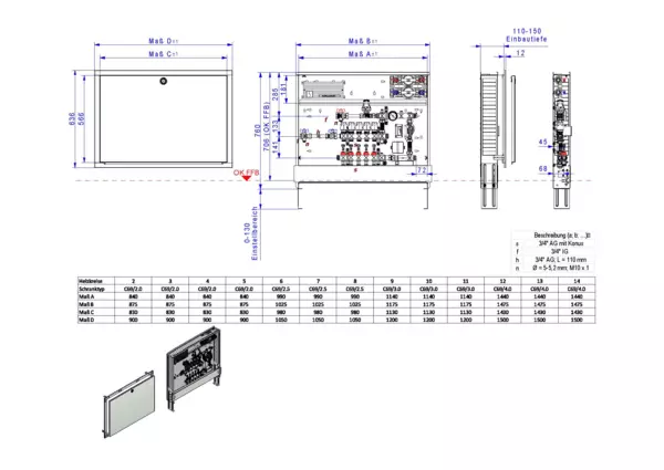 Festwertregelung 20-50 Grad Celsius mit Pumpe Wilo Para 15-130/6-43/SC-12, horizontale Anschlussgarnitur mit Wärmezählervorbereitung,Verteiler mit Durchflussanzeiger 0-3 l/min im Vorlaufbalken und Thermostatventileinsatz M30x1,5 im Rücklaufbalken, mit vormontierten Stellantrieben und Klemmleiste mit Vorverdrahtung, Wasserzählerstrecken Trinkwasser kalt und warm, Comfort-Unterputz-Schrank Frontblende RAL 9016