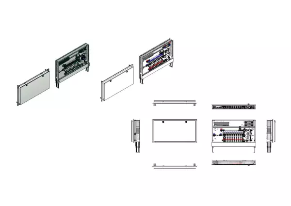 Die Regelstation für Flächenheizung ist mit einer Festwertregelung 20-50 °C ausgestattet. Die im Unterputzschrank montierte Regelgruppe umfasst eine Umwälzpumpe, einen Edelstahlverteiler mit regulierbaren Durchflussanzeigern und Ventileinsätzen (M30x1,5), sowie eine horizontale Anschlussgarnitur mit Wärmezählerverrohrung. Zusätzlich sind Wasserzählereinbaustrecken für Trinkwasser kalt und warm vorhanden. Die vormontierten und verdrahteten Stellantriebe sind auf einer montierten Klemmleiste installiert.