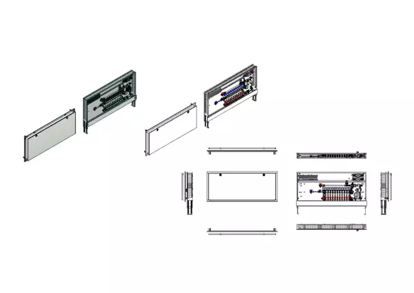 Die Regelstation für Flächenheizung ist mit einer Festwertregelung 20-50 °C ausgestattet. Die im Unterputzschrank montierte Regelgruppe umfasst eine Umwälzpumpe, einen Edelstahlverteiler mit regulierbaren Durchflussanzeigern und Ventileinsätzen (M30x1,5), sowie eine horizontale Anschlussgarnitur mit Wärmezählerverrohrung. Zusätzlich sind Wasserzählereinbaustrecken für Trinkwasser kalt und warm vorhanden. Die vormontierten und verdrahteten Stellantriebe sind auf einer montierten Klemmleiste installiert.