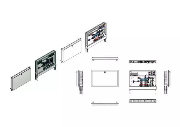 Die Regelstation für Flächenheizung ist mit einer Festwertregelung 20-50 °C ausgestattet. Die im Unterputzschrank montierte Regelgruppe umfasst eine Umwälzpumpe, einen Edelstahlverteiler mit absperrbaren Durchflussanzeigern und Ventileinsätzen für EGO-Schnellverschluss, sowie eine horizontale Anschlussgarnitur mit Wärmezählerverrohrung. Zusätzlich sind Wasserzählereinbaustrecken für Trinkwasser kalt und warm vorhanden. Die vormontierten und verdrahteten EGO-Regelantriebe sind auf einer montierten Klemmleiste installiert.