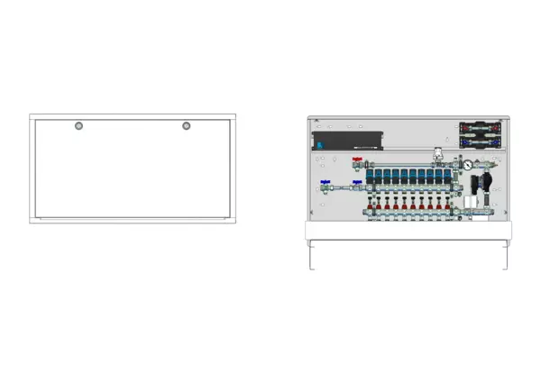 strawa Comfort Regelstation FBR-18-H-W2-WMZ-C69-EGO 10 Hkr.,BxHxT: 1200 x 775 x 122 mm, Festwert 20-50°C m. Pump, hor. AG m. WMZ, Verteil m. DFA min/max+THV f. EGO, vorm. EGO+Klemml. m. Vorverdr., WZ-Strecke TW kalt+warm, CUP-Schrank m. Frontbl. RAL9016