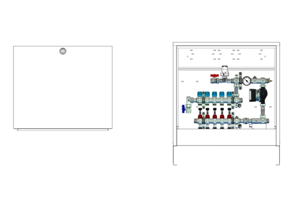 strawa Comfort Regelstation FBR-18-V-CA 5 Hkr.,BxHxT: 732x710x125 mm, Festwert 20-50°C mit Pumpe, vert. AG o. WMZ, Verteiler mit DFA min/max + THV f. EGO, Comfort-AP-Schrank in RAL 9016