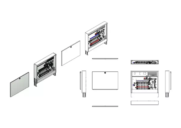 Die Regelstation für Flächenheizung ist mit einer Festwertregelung 20-50 °C ausgestattet. Die im Aufputzschrank montierte Regelgruppe umfasst eine Umwälzpumpe, einen Edelstahlverteiler mit regulierbaren Durchflussanzeigern und Ventileinsätzen (M30x1,5), sowie eine vertikale Anschlussgarnitur ohne Wärmezählerverrohrung. Die vormontierten und verdrahteten Stellantriebe sind auf einer montierten Klemmleiste installiert.