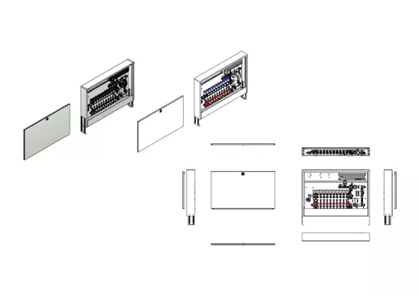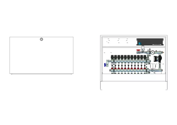 Die Regelstation für Flächenheizung ist mit einer Festwertregelung 20-50 °C ausgestattet. Die im Aufputzschrank montierte Regelgruppe umfasst eine Umwälzpumpe, einen Edelstahlverteiler mit regulierbaren Durchflussanzeigern und Ventileinsätzen (M30x1,5), sowie eine vertikale Anschlussgarnitur ohne Wärmezählerverrohrung. Die vormontierten und verdrahteten Stellantriebe sind auf einer montierten Klemmleiste installiert.