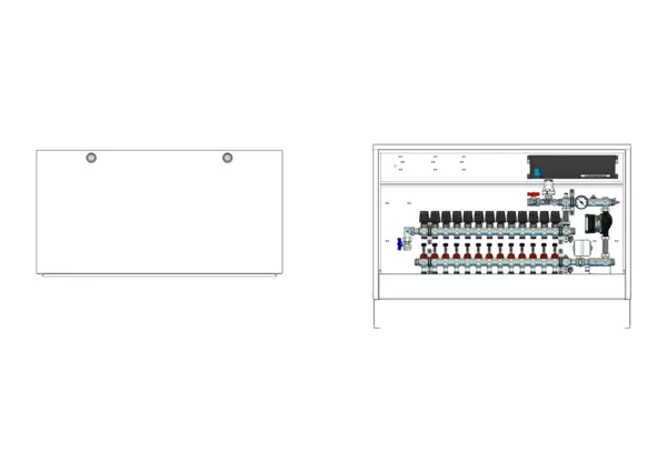 strawa Comfort Regelstation FBR-63-V-CA-E 13 Hkr.,BxHxT: 1182x710x125 mm, Festwert 20-50°C mit Pumpe, vert. AG o. WMZ, Verteiler mit DFA 0-3 l/min + THV M30x1,5, vorm. Stellantr. + Klemml. m. Vorverdr., Comfort-AP-Schrank in RAL 9016