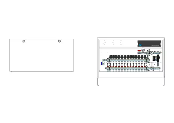 strawa Comfort Regelstation FBR-63-V-CA-E 14 Hkr.,BxHxT: 1182 x 710 x 125 mm, Festwert 20-50°C mit Pumpe, vert. AG o. WMZ, Verteiler mit DFA 0-3 l/min + THV M30x1,5, vorm. Stellantr. + Klemml. m. Vorverdr., Comfort-AP-Schrank in RAL 9016