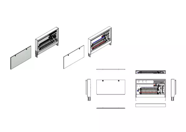 Die Regelstation für Flächenheizung ist mit einer Festwertregelung 20-50 °C ausgestattet. Die im Aufputzschrank montierte Regelgruppe umfasst eine Umwälzpumpe, einen Edelstahlverteiler mit regulierbaren Durchflussanzeigern und Ventileinsätzen (M30x1,5), sowie eine vertikale Anschlussgarnitur ohne Wärmezählerverrohrung. Die vormontierten und verdrahteten Stellantriebe sind auf einer montierten Klemmleiste installiert.