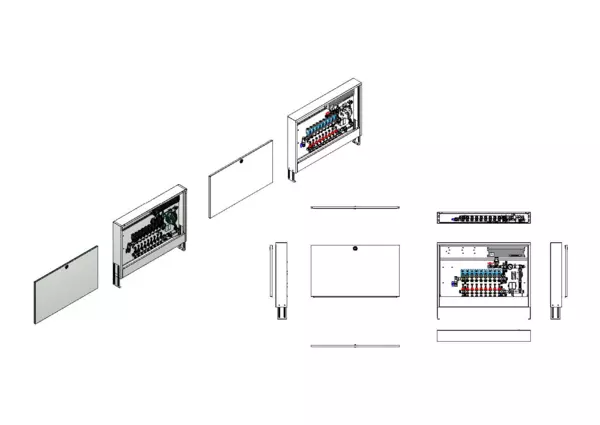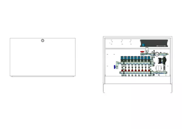 strawa Comfort Regelstation FBR-18-V-CA-EGO 9 Hkr.,BxHxT: 1032x710x125 mm, Festwert 20-50°C mit Pumpe, vert. AG o. WMZ, Verteiler mit DFA min/max + THV f. EGO, vorm. EGO-Regel. + Klemml. m. Vorverdr., Comfort-AP-Schrank in RAL 9016
