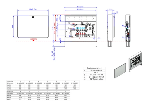 Festwertregelung 20-50 Grad Celsius mit Pumpe Wilo Para 15-130/6-43/SC-12, vertikale Anschlussgarnitur mit Wärmezählervorbereitung, Verteiler mit Durchflussanzeiger min/max im Vorlaufbalken und Thermostatventileinsatz für EGO-Aufnahme im Rücklaufbalken, Comfort-Aufputz-Schrank in RAL 9016