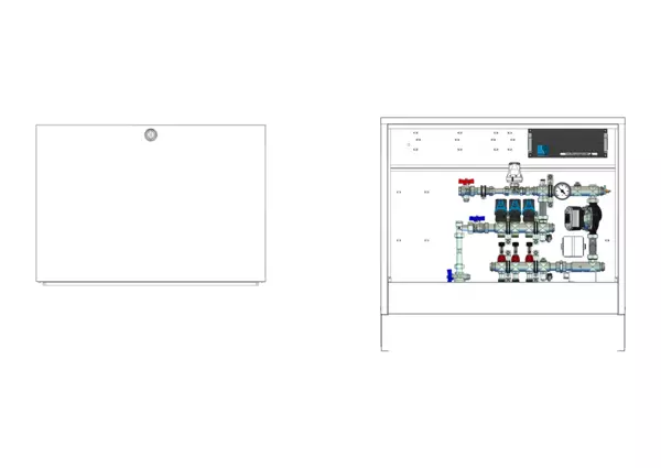 Die Regelstation für Flächenheizung ist mit einer Festwertregelung 20-50 °C ausgestattet. Die im Aufputzschrank montierte Regelgruppe umfasst eine Umwälzpumpe, einen Edelstahlverteiler mit absperrbaren Durchflussanzeigern und Ventileinsätzen für EGO-Schnellverschluss, sowie eine vertikale Anschlussgarnitur mit Wärmezählerverrohrung. Die vormontierten und verdrahteten EGO-Regelantriebe sind auf einer montierten Klemmleiste installiert.