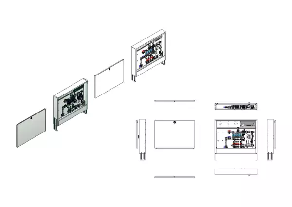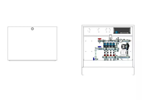 strawa Comfort Regelstation FBR-18-V-WMZ-CA-EGO 4 Hkr.,BxHxT: 882x710x125 mm, Festwert 20-50°C mit Pumpe, vert. AG m. WMZ, Verteiler mit DFA min/max + THV f. EGO, vorm. EGO-Regel. + Klemml. m. Vorverdr., Comfort-AP-Schrank in RAL 9016