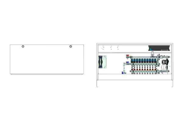 strawa Comfort Regelstation FBR-18-V-W1-WMZ-CA-EGO 10 Hkr.,BxHxT: 1482 x 710 x 125 mm, Festwert 20-50°C mit Pumpe, vert. AG m. WMZ, Verteiler mit DFA min/max+THV f. EGO, vorm. EGO-Regel.+Klemml. m. Vorverdr., WZ-Strecke TW kalt, CAP-Schrank in RAL 9016