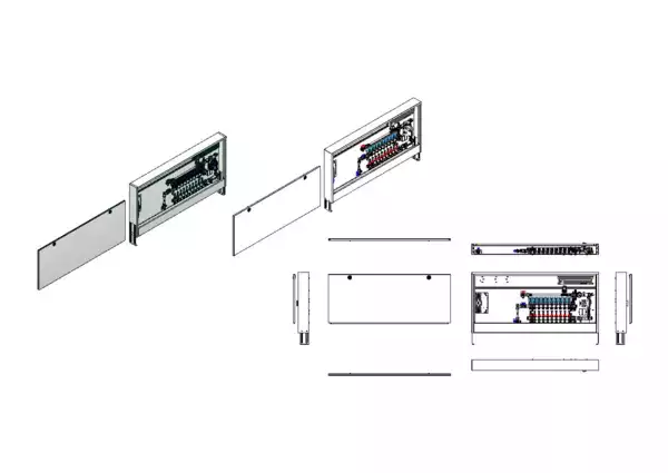 Die Regelstation für Flächenheizung ist mit einer Festwertregelung 20-50 °C ausgestattet. Die im Aufputzschrank montierte Regelgruppe umfasst eine Umwälzpumpe, einen Edelstahlverteiler mit absperrbaren Durchflussanzeigern und Ventileinsätzen für EGO-Schnellverschluss, sowie eine vertikale Anschlussgarnitur mit Wärmezählerverrohrung. Zusätzlich ist eine Wasserzählereinbaustrecke für Trinkwasser kalt, vormontierte und vorverdrahtete EGO-Regelantriebe auf vormontierter Klemmleiste.