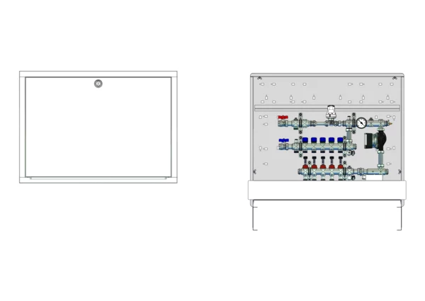 Die Kompakt-Regelstation für Flächenheizung ist mit einer Festwertregelung 20-50 °C und einem Hochtemperaturabgang für statische Heizflächen (z.B. Badheizkörper) ausgestattet. Die im Unterputzschrank montierte Regelgruppe umfasst eine Umwälzpumpe, einen Edelstahlverteiler mit regulierbaren Durchflussanzeigern und Ventileinsätzen (M30x1,5), sowie eine horizontale Anschlussgarnitur ohne Wärmezählerverrohrung. Es gibt Platzhaltungen für Wasserzählerstrecken, eine Klemmleiste und Stellantriebe.