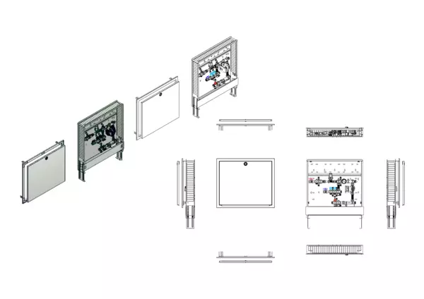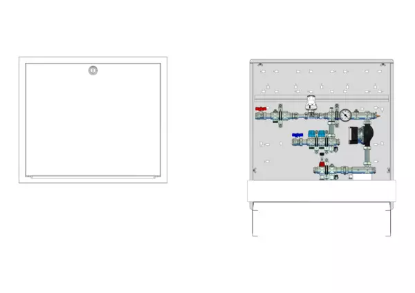 Die Kompakt-Regelstation für Flächenheizung ist mit einer Festwertregelung 20-50 °C und einem Hochtemperaturabgang für statische Heizflächen (z.B. Badheizkörper) ausgestattet. Die im Unterputzschrank montierte Regelgruppe umfasst eine Umwälzpumpe, einen Edelstahlverteiler mit absperrbaren Durchflussanzeigern und Ventileinsätzen für EGO-Schnellverschluss, sowie eine horizontale Anschlussgarnitur ohne Wärmezählerverrohrung. Es sind Platzhaltungen für Wasserzählerstrecken, eine Klemmleiste und EGO-Regelantriebe vorhanden.