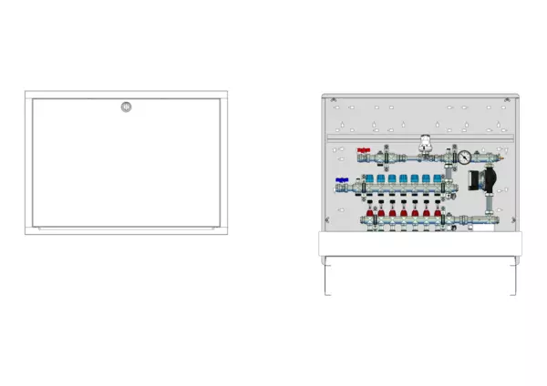strawa Comfort Kompakt-Regelstation FBR-18-HT1-H-C69 7 Hkr.,BxHxT: 900x775x122 mm, Festwert 20-50°C mit Pumpe, 1x Hochtemperaturabgang, horz. AG o. WMZ, Verteiler m. DFA min/max + THV für EGO, Comfort-UP-Schrank m. Frontbl. RAL 9016