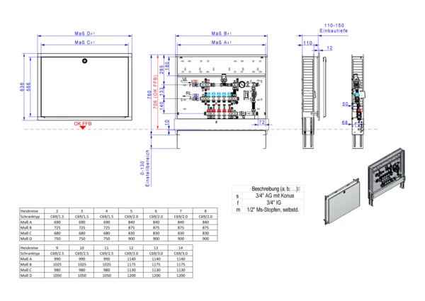 Die Kompakt-Regelstation für Flächenheizung ist mit einer Festwertregelung 20-50 °C und einem Hochtemperaturabgang für statische Heizflächen (z.B. Badheizkörper) ausgestattet. Die im Unterputzschrank montierte Regelgruppe umfasst eine Umwälzpumpe, einen Edelstahlverteiler mit absperrbaren Durchflussanzeigern und Ventileinsätzen für EGO-Schnellverschluss, sowie eine horizontale Anschlussgarnitur ohne Wärmezählerverrohrung. Es sind Platzhaltungen für Wasserzählerstrecken, eine Klemmleiste und EGO-Regelantriebe vorhanden.