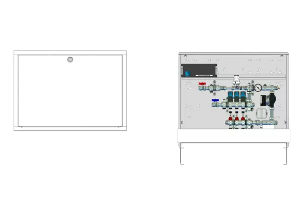 strawa Comfort Kompakt-Regelstation FBR-18-HT1-H-C69-EGO 3 Hkr.,BxHxT: 750x775x122 mm, Festwert 20-50°C m. Pumpe, 1x HT-Abgang, horz. AG o. WMZ, Verteiler m. DFA min/max + THV f EGO, vorm. EGO-Regel.+Klemml. m. Vorverdr., CUP-Schrank Frontbl RAL9016