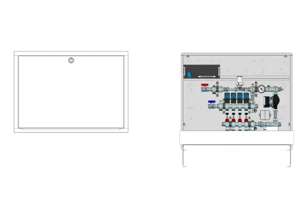 strawa Comfort Kompakt-Regelstation FBR-18-HT1-H-C69-EGO 4 Hkr.,BxHxT: 750x775x122 mm, Festwert 20-50°C m. Pumpe, 1x HT-Abgang, horz. AG o. WMZ, Verteiler m. DFA min/max + THV f EGO, vorm. EGO-Regel.+Klemml. m. Vorverdr., CUP-Schrank Frontbl RAL9016
