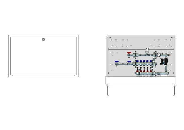 Kompakt-Regelstation für Flächenheizung mit Festwertregelung 20-50 ° C und Hochtemperaturabgang für statische Heizfläche (z.B. Badheizkörper), im Unterputzschrank montierte Regelgruppe mit Umwälzpumpe,