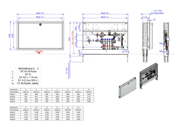 Die Festwertregelstation mit Hochtemperaturabgang ist für Flächenheizungen und der zusätzlichen Versorgung einer statischen Heizfläche, wie z.B. einem Badheizkörper, geeignet. Hydraulisch wird die Station am Durchflussanzeiger der Heizkreise manuell abgeglichen. Im Comfort-Unterputzschrank mit Frontblende in weiß RAL 9016 mit einer Einbautiefe von 110-150 mm ist ein Hochtemperaturabgang für die statische Heizflächen und die Festwertregelgruppe mit integrierten Festwertregelkopf 20-50°C und geregelter Pumpe verbaut. Ein Edelstahlverteiler mit absperrbaren und regulierbaren Durchflussanzeigern 0-3 l/min im Vorlaufbalken und Thermostatventileinsätzen (M30x1,5) im Rücklaufbalken ist schallentkoppelt montiert. Der Temperaturbegrenzer verhindert Übertemperaturen größer 60 °C. Eine horizontale Anschlussgarnitur mit Wärmezählervorbereitung 3/4" Länge 110 mm und Fühleranschluss 5-5,2 M10x1 im Vor- und Rücklaufkugelhahn ist montiert. Zusätzlich müssen Stellantriebe und Klemmleiste bauseits nachgerüstet werden.