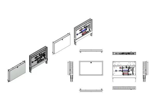 Edelstahlverteiler mit regulierbaren Durchflussanzeigern und Ventileinsätzen (M30x1,5), und horizontale Anschlussgarnitur mit Wärmezählerverrohrung, Platzhaltung für Wasserzählereinbaustrecke, Klemmleiste und Stellantriebe