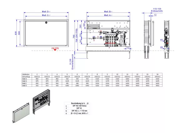 Die Kompakt-Regelstation für Flächenheizung ist mit einer Festwertregelung 20-50 °C und einem Hochtemperaturabgang für statische Heizflächen (z.B. Badheizkörper) ausgestattet. Die im Unterputzschrank montierte Regelgruppe umfasst eine Umwälzpumpe, einen Edelstahlverteiler mit regulierbaren Durchflussanzeigern und Ventileinsätzen (M30x1,5), sowie eine horizontale Anschlussgarnitur mit Wärmezählerverrohrung. Die vormontierten und verdrahteten Stellantriebe sind auf einer montierten Klemmleiste installiert. Es gibt Platzhaltungen für Wasserzählereinbaustrecken.