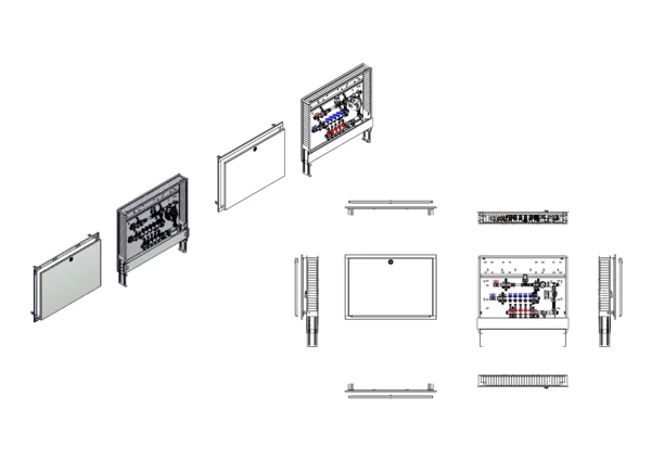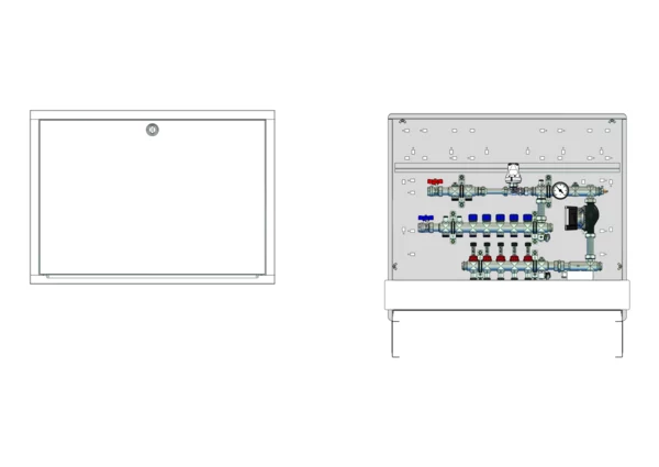 Die Kompakt-Regelstation für Flächenheizung ist mit einer Festwertregelung 20-50 °C und zwei Hochtemperaturabgängen für statische Heizflächen (z.B. Badheizkörper) ausgestattet. Die im Unterputzschrank montierte Regelgruppe umfasst eine Umwälzpumpe, einen Edelstahlverteiler mit regulierbaren Durchflussanzeigern und Ventileinsätzen (M30x1,5), sowie eine horizontale Anschlussgarnitur ohne Wärmezählerverrohrung. Es gibt Platzhaltungen für Wasserzählerstrecken, eine Klemmleiste und Stellantriebe.