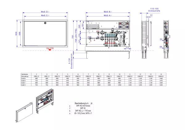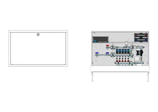 strawa Comfort Kompakt-Regelstation FBR-18-HT2-H-W2-WMZ-C69-EGO 5 Hkr.,BxHxT: 1050 x 775 x 122 mm, Festwert 20-50°C m Pum, 2x HT-Abg, horz. AG m. WMZ, Verteiler m. DFA min/max+THV für EGO, vorm. EGO-Regelantr., WZ-TW kalt+warm, CUP-Schrank RAL9015
