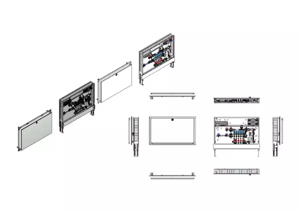 Die Kompakt-Regelstation für Flächenheizung ist mit einer Festwertregelung 20-50 °C und zwei Hochtemperaturabgänge für statische Heizflächen (z.B. Badheizkörper) ausgestattet. Die im Unterputzschrank montierte Regelgruppe umfasst eine Umwälzpumpe, einen Edelstahlverteiler mit absperrbaren Durchflussanzeigern und Ventileinsätzen für EGO-Schnellverschluss, sowie horizontale Anschlussgarnitur mit Wärmezählerverrohrung. Zusätzlich sind Wasserzählereinbaustrecken für Trinkwasser kalt und warm vorhanden. Die vormontierten und verdrahteten EGO-Regelantriebe sind auf einer montierten Klemmleiste installiert.
