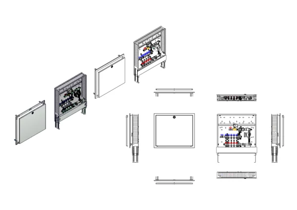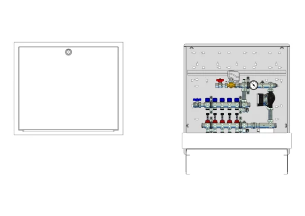 Die Mischstation für Flächenheizung ist mit einer witterungsgeführten Vorlauf-Temperaturregelung (Regler nicht im Lieferumfang) ausgestattet. Die im Unterputzschrank montierte Mischgruppe umfasst eine Umwälzpumpe, einen Edelstahlverteiler mit regulierbaren Durchflussanzeigern und Ventileinsätzen (M30x1,5), sowie eine und horizontale Anschlussgarnitur ohne Wärmezählerverrohrung. Es gibt Platzhaltungen für eine Klemmleiste und Stellantriebe.