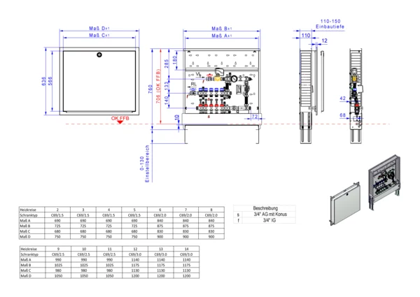 Die Mischstation für Flächenheizung ist mit einer witterungsgeführten Vorlauf-Temperaturregelung (Regler nicht im Lieferumfang) ausgestattet. Die im Unterputzschrank montierte Mischgruppe umfasst eine Umwälzpumpe, einen Edelstahlverteiler mit regulierbaren Durchflussanzeigern und Ventileinsätzen (M30x1,5), sowie eine und horizontale Anschlussgarnitur ohne Wärmezählerverrohrung. Es gibt Platzhaltungen für eine Klemmleiste und Stellantriebe.