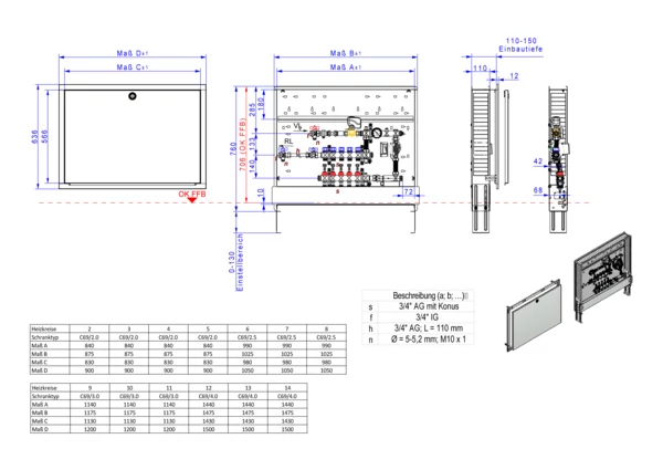 Die Mischstation für Flächenheizung ist mit einer witterungsgeführten Vorlauf-Temperaturregelung (Regler nicht im Lieferumfang) ausgestattet. Die im Unterputzschrank montierte Mischgruppe umfasst eine Umwälzpumpe, einen Edelstahlverteiler mit regulierbaren Durchflussanzeigern und Ventileinsätzen (M30x1,5), sowie eine horizontale Anschlussgarnitur mit Wärmezählerverrohrung. Es gibt Platzhaltungen für Wasserzählereinbaustrecken, eine Klemmleiste und Stellantriebe.