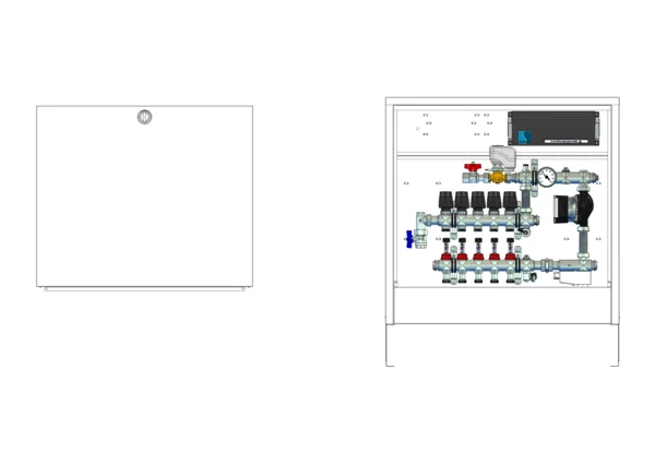strawa Comfort Mischstation FBM-63-V-CA-E 5 Hkr.,BxHxT: 732 x 710 x 125 mm, Mischg. m 3P SM mit Pumpe, vert. AG o. WMZ, Verteiler mit DFA 0-3 l/min + THV M30x1,5, vorm. Stellantr. + Klemml. m. Vorverdr., Comfort-AP-Schrank in RAL 9016