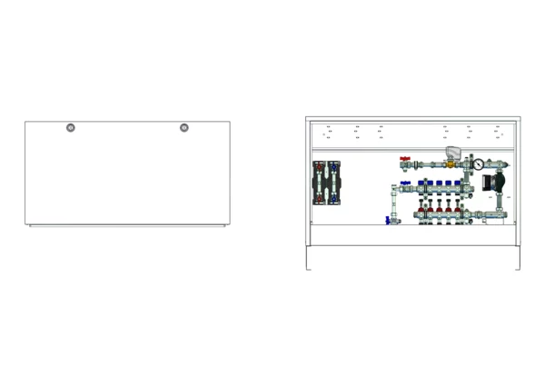 Die Mischstation für Flächenheizung ist mit einer witterungsgeführten Vorlauf-Temperaturregelung (Regler nicht im Lieferumfang) ausgestattet. Die im Aufputzschrank montierte Mischgruppe umfasst eine Umwälzpumpe, einen Edelstahlverteiler mit regulierbaren Durchflussanzeigern und Ventileinsätzen (M30x1,5), sowie eine horizontale Anschlussgarnitur mit Wärmezählerverrohrung. Zusätzlich sind Wasserzählereinbaustrecken für Trinkwasser kalt und warm vorhanden. Die vormontierten und verdrahteten Stellantriebe sind auf einer montierten Klemmleiste installiert.