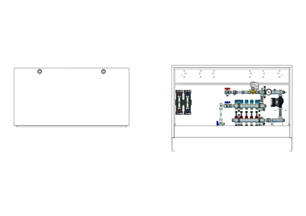 strawa Comfort Mischstation FBM-18-V-W2-WMZ-CA 5 Hkr.,BxHxT: 1182x710x125 mm, Mischg. m 3P SM mit Pumpe, vert. AG m. WMZ, Verteiler mit DFA min/max + THV f. EGO, WZ-Strecke TW kalt+warm, Comfort-AP-Schrank in RAL 9016